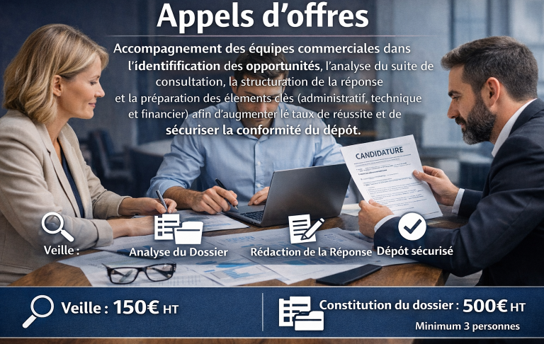 Accompagnement des équipes commerciales dans l’identification des opportunités, l’analyse du dossier de consultation, la structuration de la réponse et la préparation des éléments clés (administratif, technique et financier) afin d’augmenter le taux de réussite et de sécuriser la conformité du dépôt.